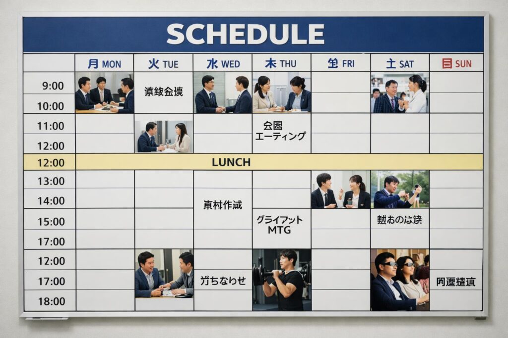 スケジュールを立てるときは、「完璧に守ること」を目標にするのではなく、「7〜8割守れたら合格」くらいの気持ちで続けることがポイントです。体調や仕事の忙しさによって予定どおりにいかない日もあるため、多少のズレは想定した上で、翌日以降で整えていくスタンスを持ちましょう。