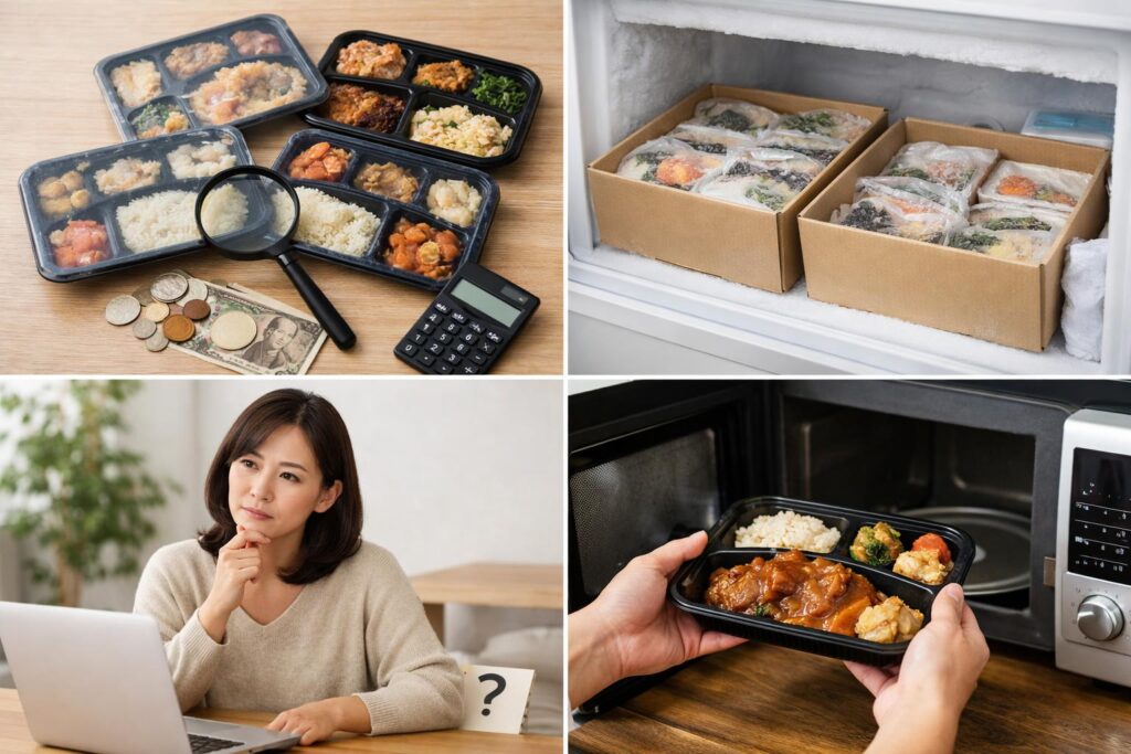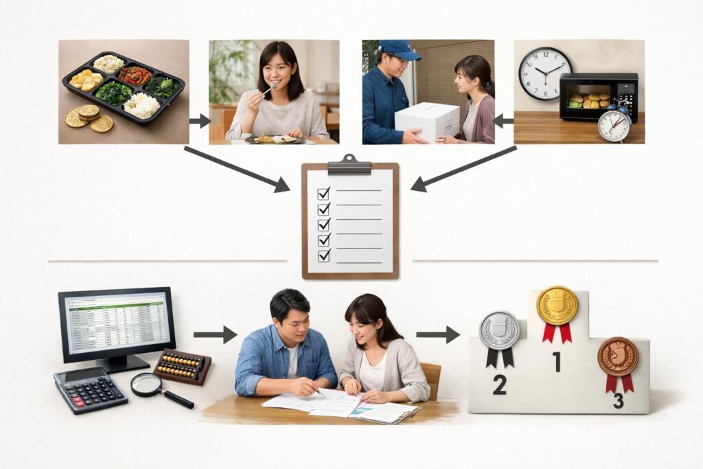 そのため、本記事でコスパを比較するときは、「同じように平日の夕食や昼食として1か月に何回利用するか」をそろえたうえで、トータルの食費・かかる時間・栄養バランスの3つを基準に、冷凍宅配弁当とスーパーやコンビニ弁当を見比べることを前提とします。